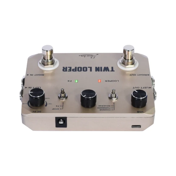 Housed in a sleek, golden, full metal-aluminum alloy body, the TWIN LOOPER is as tough as it is beautiful. Its heavy-duty footswitch ensures reliable engagement every time, while true bypass switching guarantees your pure tone remains untouched when the pedal is off. Its compact size saves precious pedalboard space without compromising on durability or features.